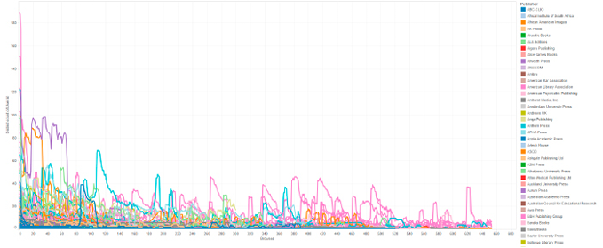 We developed an interactive visualization showing the number of user sessions for reading individual pages across all e-books and grouped by publishers (screenshot shown in figure 4). The visualization shows that users tended to browse the beginning of e-books, and there are higher number of sessions (“spikes”) on other page ranges for certain e-books and publishers. Those “spikes” suggest that users selected a few pages or sections of some e-books to read, potentially based on their research or study needs.