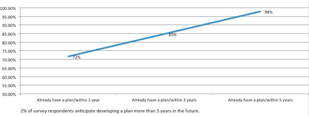Of the 46 survey respondents who indicated that they have a plan or anticipate developing one, 72 percent will do so within the next year; 85 percent will do so within the next three years; and 98 percent will do so within the next five years (see figure 1). The remaining respondent suggested that development of a phased retirement plan would likely be more than five years in the future.