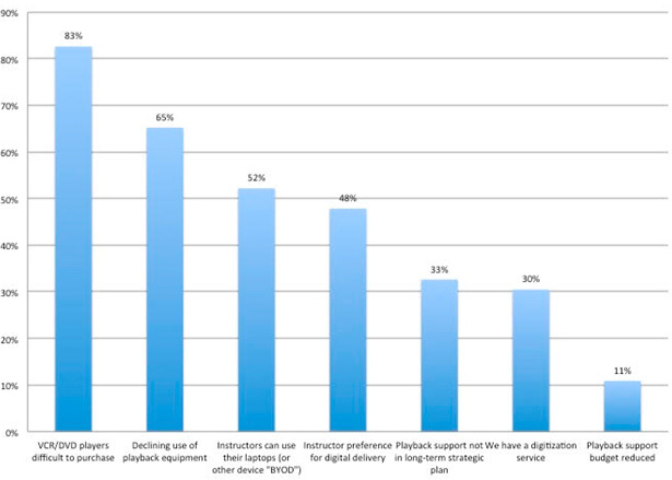 Respondents were more sanguine about the long-term prospects for DVD playback capability: the only people who explicitly mentioned withdrawing DVD players from classrooms noted that they were replacing them with Blu-ray players, a device which is backwards-compatible with DVD, or computers equipped with DVD drives. Even here, though, our data revealed worrying signs. A total of 83 percent of survey respondents mentioned marketplace factors such as DVD and VHS players becoming difficult to find as a reason to develop phased retirement plans for playback equipment, and this was a major theme among participants in follow-up interviews as well. Other reasons cited by more than 48 percent of survey respondents include a decrease in the use of playback equipment, an increase in instructor preferences for online digital delivery of video content, and a shift toward playback on instructor-owned devices such as laptops or tablets. What all of these things have in common is that they are largely out of the respondents’ control. Media librarians on the Videolib listserv have already reported problems acquiring content available only through subscription services like Netflix,33 whose terms of use permit only “personal” uses,34 and at least one prominent distributor of educational videos has mentioned the possibility of suspending the production of DVDs altogether and releasing content only in the form of streaming video.35 If these trends continue, marketplace factors and instructor preferences could conspire to rapidly accelerate DVD’s and possibly even Blu-ray’s progress toward obsolescence.