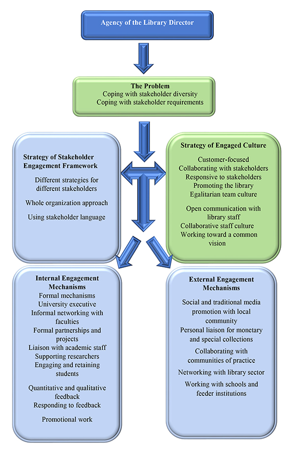 This paper reports a section of the findings of the research of Fiona Harland10 and Fiona Harland, Glenn Stewart, and Christine Bruce.11 The theory provides an understanding of how library directors can ensure their library is holistically and continuously engaging with stakeholders.12 The theory begins with the agency of the library director in recognizing the need for the library to know its stakeholders and their requirements and that the library’s response is adequate. The library director, with senior library staff, then develops a holistic engagement framework that is mutually dependent upon an organizational culture that is actively and continuously engaging with the library’s stakeholders. Various mechanisms then enable the library to engage with its stakeholder communities in ways that are appropriate to each group.