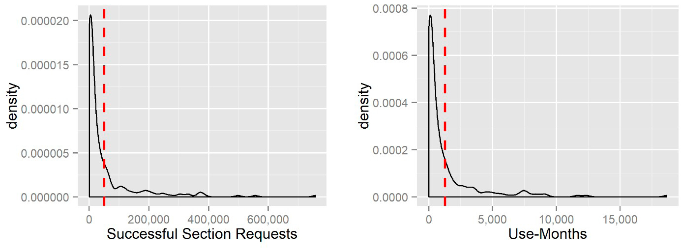Of course, we don’t usually look at use data during a four-year period; instead, we generally collect our statistics annually. By subjecting the annual data from the four years in this study, from 2012 through 2015, to the same transformation as above, and excluding subclasses with fewer than 100 successful section requests per year, we see a similarly consistent relationship between the intensive and extensive uses. During the full course of the study, the mean reduction from successful section requests to number of use months per title is 96.44 percent, the median 97 percent. The distribution is very tight, with a coefficient of variation of only 2.18 percent. For 2015, the mean is 97.19 percent, the median 97.7 percent, and the coefficient of variation 2.06 percent. Other years in the study are remarkably similar (see table 1 and figure 6).