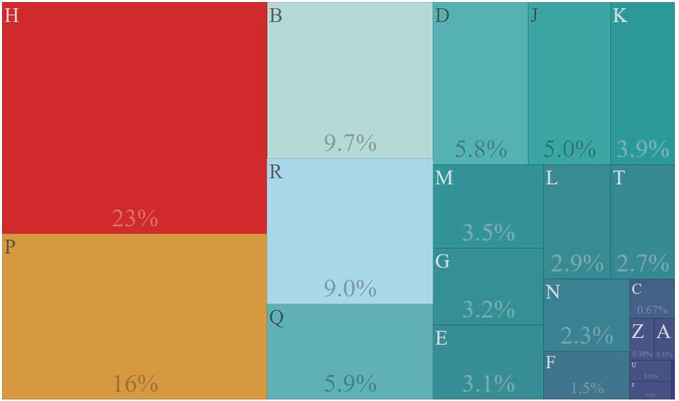 Looking at monthly use data at the basic class level, LC class H consistently makes up the largest percentage of successful section requests (see figure 2). Across the entire four years of this study, we see that there were 2.79 million successful section requests for ebooks classed in H, making up 23 percent of the total number of successful section requests during this period. Class P makes up the second largest group by use with a 16 percent share due to the 1.99 million successful section requests, compared to 35,400 titles held, accounting for 13 percent of the total.