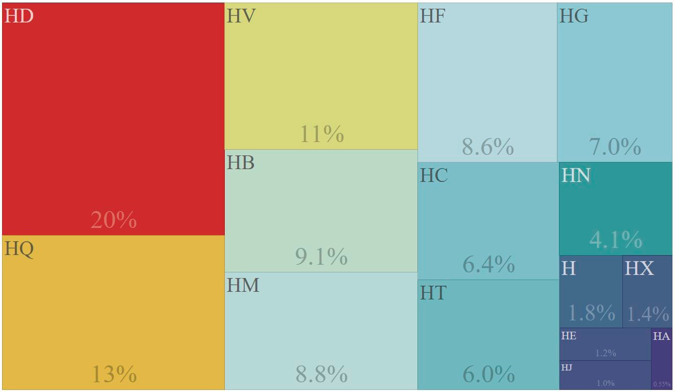 If we subject our monthly sampled data to binary reduction to derive the use-month value, where each positive value for a title counts only as one, and then those monthly totals are added up across the 48 months of the study, LC class H use counts for only 63,100 uses. Binary reduction of successful section requests has resulted in a reduction of almost 98 percent. In the reduced data, class H continues to be the most-used class in the transformed dataset, making up 21 percent of uses (compared to 23 percent in the original data) to 17 percent for P (compared to 16 percent in the original data) (see figures 2 and 3). Looking more closely at the subclasses, we see a similarly slight change. In the raw data, subclass HD accounts for 555,000 successful section requests during these 48 months, making up 20 percent of total uses in the H-subclasses (see figure 4). Binary reduction of the HD data results in 11,600 uses, which accounts for 18 percent of the total (see figure 5). As with the higher-level view, the relative values of the subclasses remain largely the same.