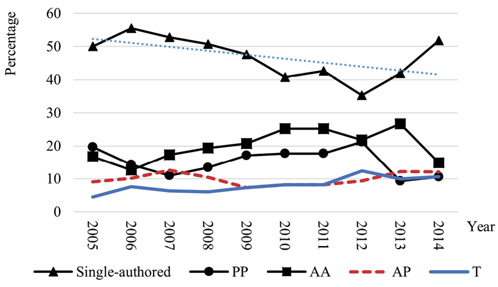 Publication patterns of articles by librarians have been investigated for decades.34 Although some librarians with faculty status have to do research and publish, researchers of previous studies have not differentiated among LIS academics, librarians with faculty status, and librarians without faculty status. The main reason is that researchers cannot identify them from author affiliation information because faculty status information is not always indicated. Even if researchers could rely on author biographical information listed in publications, websites, and other reference sources, few researchers have been willing to undertake the intensive labor required to identify author type.35 Moreover, although the Association of College and Research Libraries has set standards for faculty librarians, faculty status for librarians is provided through various means.36 Not all academic librarians with faculty status share common tasks. Some institutions also expect librarians to conduct research and publish, even if they are not required to do that.37 The diverse characteristics of librarian tasks make investigating publications by librarians a challenge. Moreover, another problem has recently been identified: are librarians with faculty status researchers or practitioners?