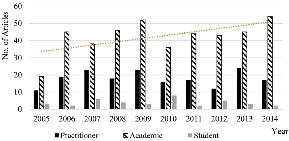 Academics and practitioners, even if they are in the same field, are from different worlds. The differences between academics and practitioners are represented by the term “academic–practitioner gap”; this gap has long existed across disciplines and has been a topic in the literature.27 Academics are primarily from academic departments of higher education institutions and engage in research activities.28 Practitioners engage in the practice of a discipline, and their main tasks do not generally involve research and publication.29 This difference in the main tasks between academics and practitioners is the reason that the scientific community overlooks practitioner authors and academic–practitioner collaborations. However, this does not mean that practitioners do not make research contributions to their own disciplines.