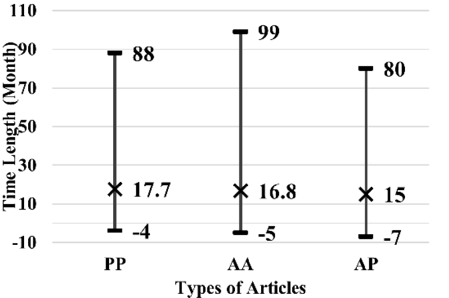 Single-author articles were also included. The academic–academic collaboration referred to articles by only academics, academic–practitioner collaboration referred to articles by both academics and practitioners, practitioner–practitioner collaboration referred to articles by only practitioners, and other collaborations referred to articles by authors with other types of affiliations, such as students. The number of authors per coauthored article was not limited to two. Therefore, a practitioner–practitioner article may be written by three librarians. Types of research collaboration, including collaboration with librarians with faculty status, were not formed because only 25 authors were identified as librarians with faculty status and each of them had only published single-authored articles. In addition, the length of time between the publication date and the first citation received for each article was calculated in the unit of months.