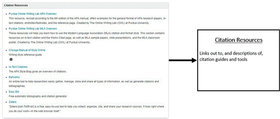 Example LibGuides box and corresponding card showing the “Citation Resources” box as it appeared in the old template, as well as the card students sorted during the study |