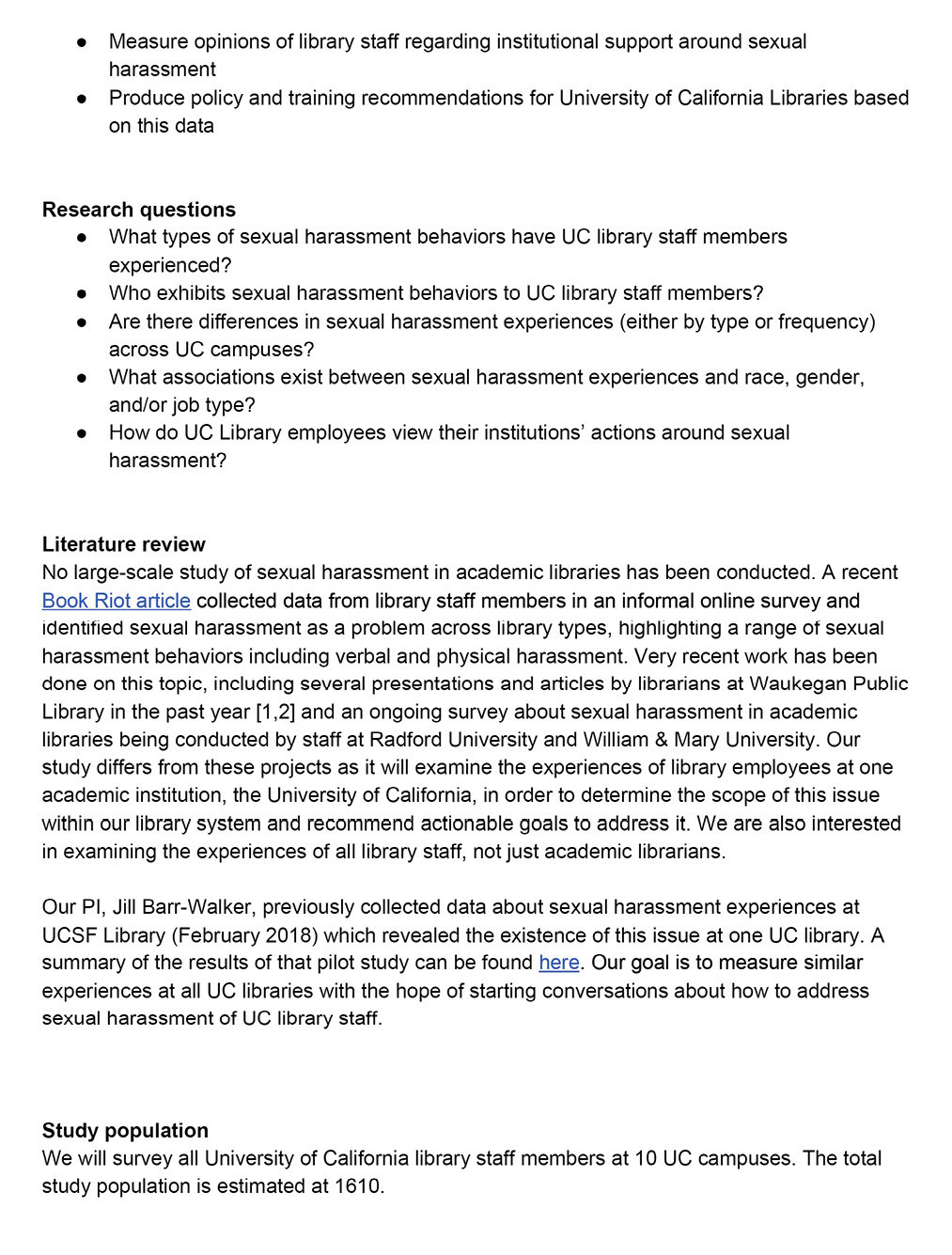 Building on the results of the UCSF pilot, we conducted a research study to understand the scope of this issue across the UC Libraries system. The aim of our study was to explore sexual harassment experiences of nonstudent employees at University of California Libraries. Our research questions included: