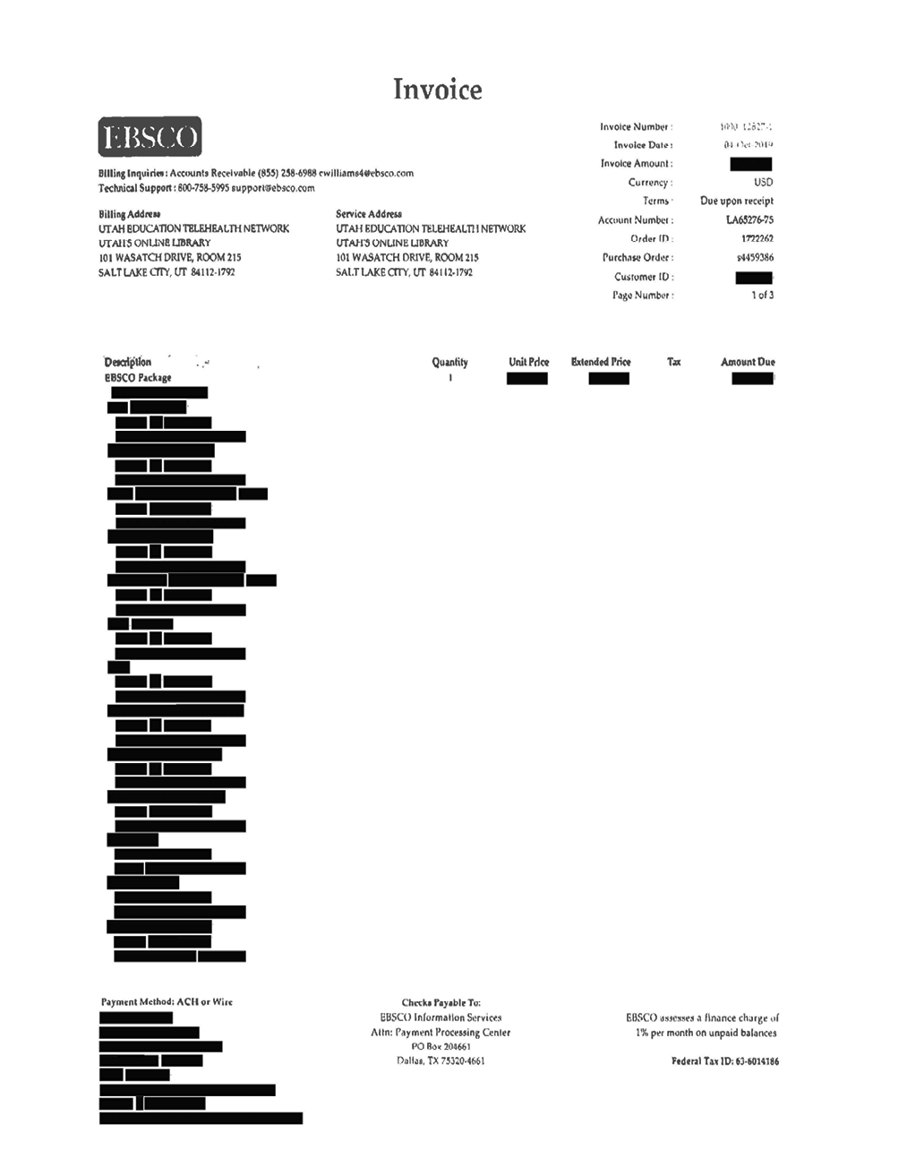 In this case, Elsevier was not successful in forcing Washington State University to redact pricing information from public records. But in a records request by the author for prices of online databases purchased by a Utah state entity, the invoice was received but everything was redacted except for contact information and column headings (see appendix F). Directions were provided for an appeal.