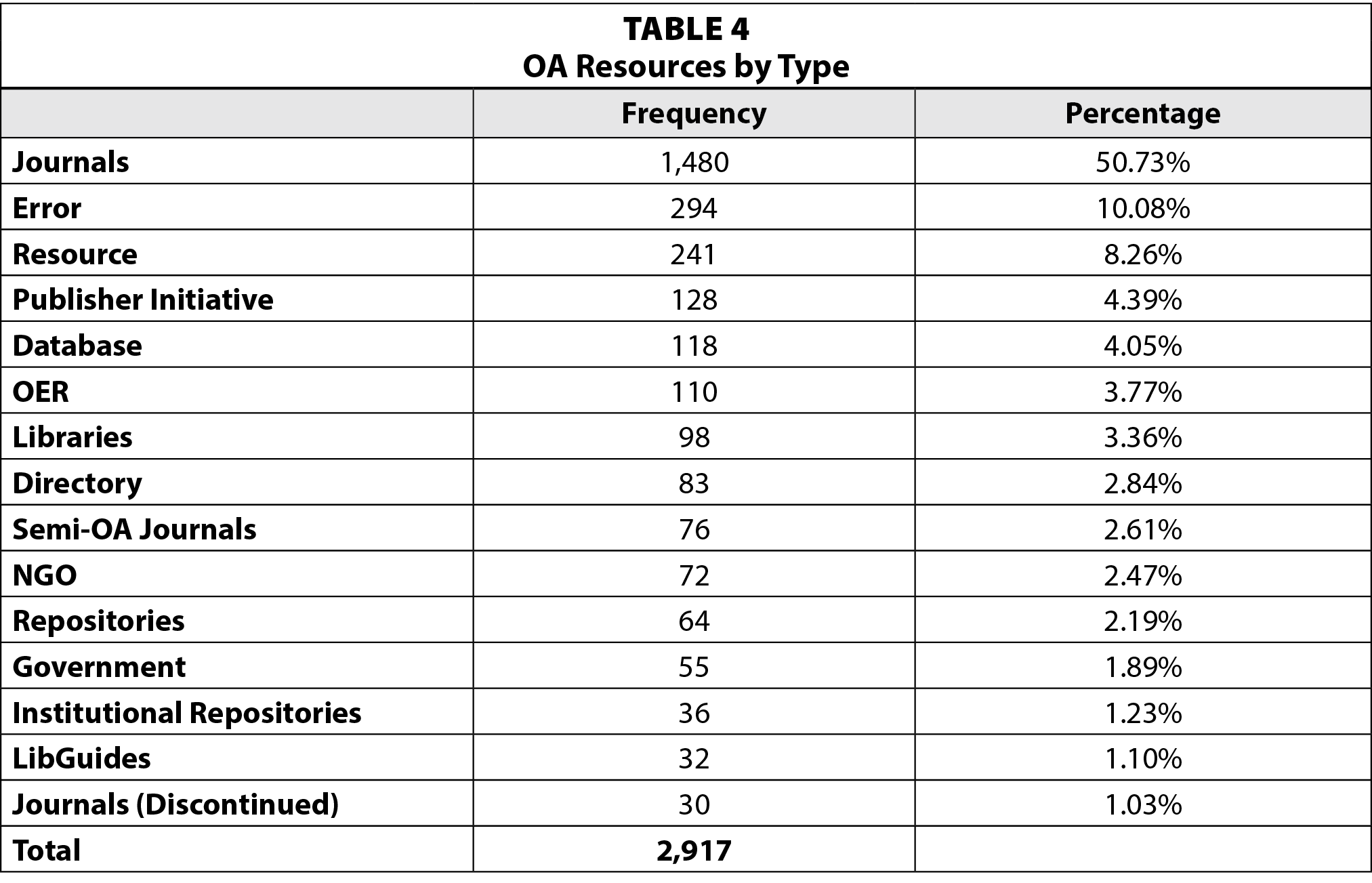 Varied resource types were linked by HEI libraries in their websites. As shown in Table 4, most of the OA links embedded on library websites of academic libraries are OA journals. This is followed by resources, such as websites and online documents, and links to publishers offering OA contents. However, 10% of the resources linked by several libraries were found to be unavailable, erroneous, and inaccessible. There are also several journals that only offer OA articles but are not fully OA in nature; these were classified as semi-OA journals. Several journals are OA but have ceased publication. Fortunately, the websites of these discontinued journals still provide access to their archives. There are also libraries that provide links redirecting users to LibGuides created by other universities, which offer other lists of OA resources. This shows that the OA resources linked by HEI libraries range from journals, resources, databases, educational resources, repositories, libraries, directories, government and non-governmental documents to even library guides. The presence of erroneous links, LibGuides, and discontinued journals in the OA links of the HEI libraries indicates the need for update of the said links to make sure that only working and relevant information sources are shared.