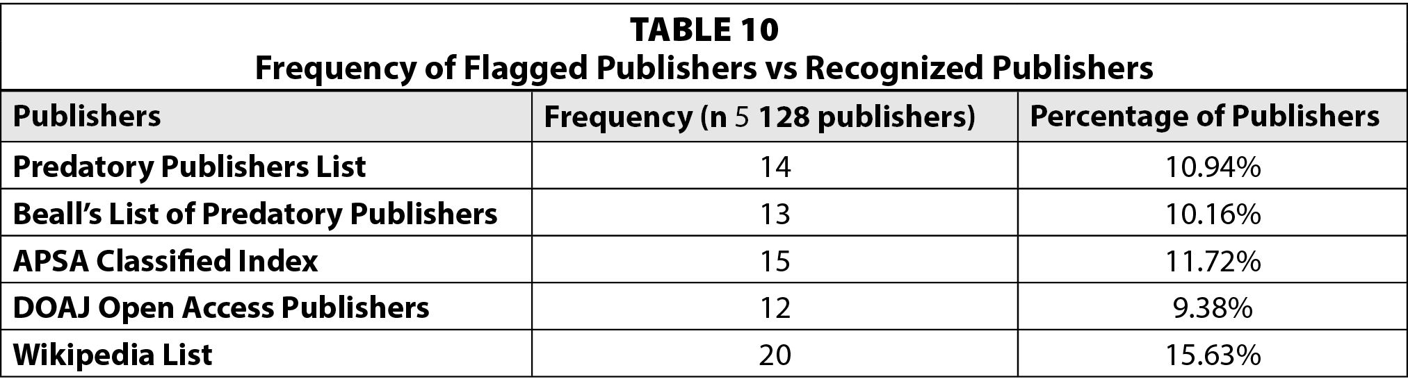 In terms of the publishers, Table 10 shows that 13 to 14 publishers shared by libraries are also found in known lists of predatory publishers. The results revealed that HEI libraries included a significant number of potentially predatory publishers in their links. Although these are 10 percent among the publishers that were linked in the libraries’ websites, HEI libraries must reexamine their dissemination initiatives to improve the quality of promoted information resources in their websites. On the other hand, 15 of the journals are classified and recognized by Australian Political Studies Association, 12 of these publishers are recognized by DOAJ, and 20 of the publishers are shared by Wikipedia. Libraries could revisit these websites and enrich their lists to include more classified and recognized titles and publishers.