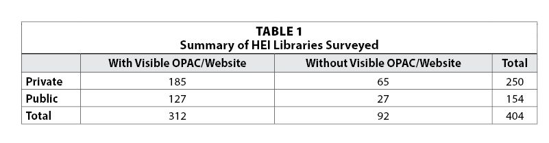 Table 1 shows the breakdown of the HEI library websites visited. Initially, 404 HEIs were identified.