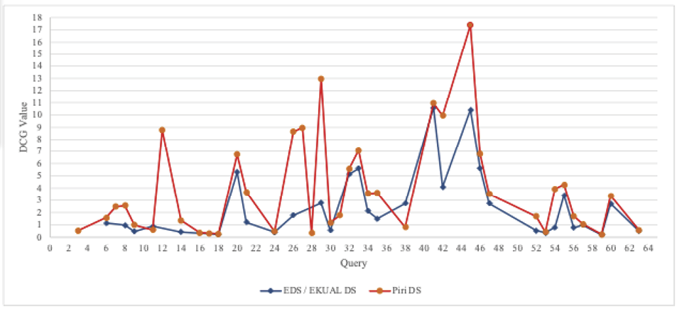 DCG (Discounted Cumulative Gain) is a metric used to measure the ranking performance of search systems based on the relevance of the results (Cossock & Zhang, 2008). DCG is calculated based on the relevance score and rank position of the results returned for a query. In this study, the DCG value was calculated using the following formula: