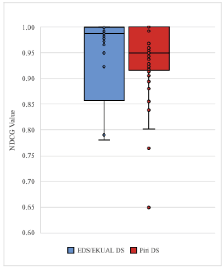 The average topical Diversity Index was calculated as 2.648 for EDS and EKUAL DS and 2.374 for Piri DS. It was found that EDS and EKUAL DS offered relatively higher topical diversity than Piri DS. The distribution of Diversity Index values is presented in Figure 4.