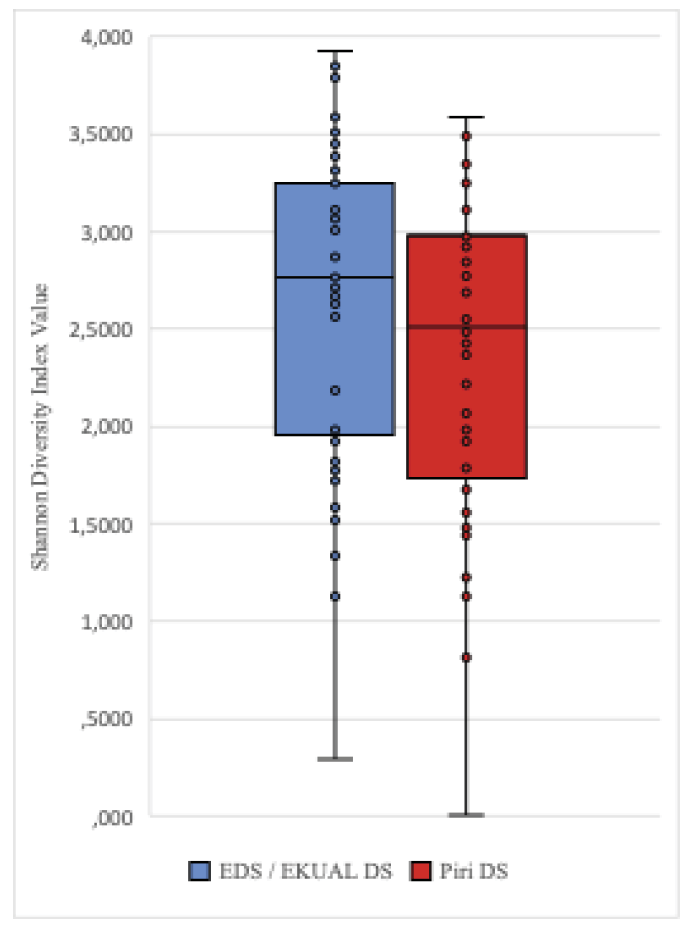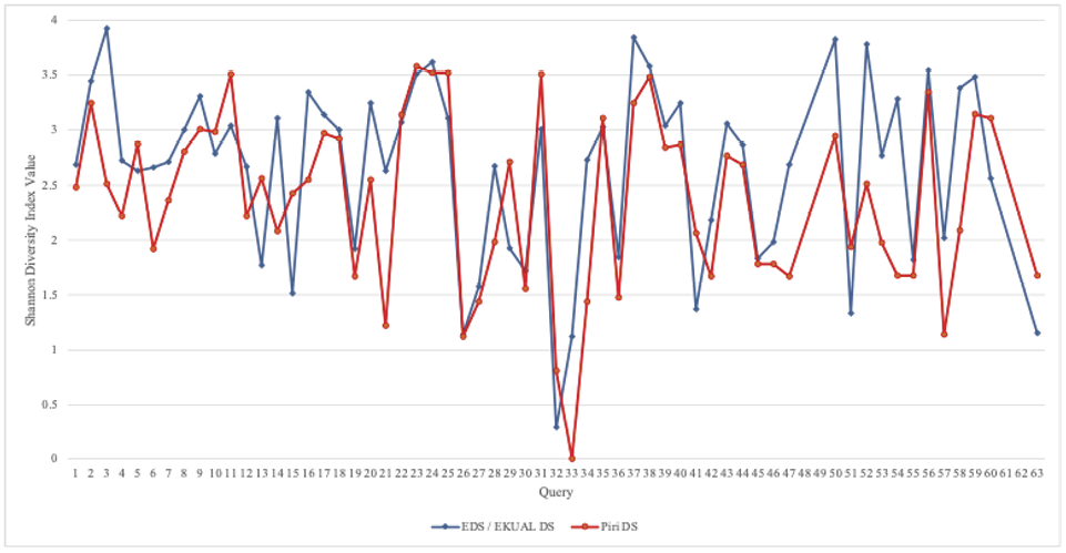 The greatest variation in diversity index values occurred in Query 3, Query 21, and Query 54. When the topic categories of the results of these queries were analyzed, it was found that EDS and EKUAL DS included a wider variety of topics in the top 20 results. The comparison of the Shannon Diversity Index between EDS / EKUAL DS, and Piri DS is presented in Figure 3.